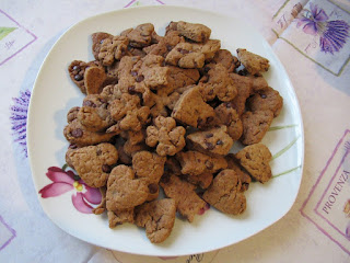 Impastare tutti gli ingredienti, aggiungendo alla fine le gocce di cioccolato. Stendere l’impasto sulla spianatoia, non ho aggiunto farina per questo perchè non serve. Ottenere dei biscottini con formine a piacere e distribuirli su una teglia con cartaforno. Cuocere a 190° per 20 – 25 minuti.