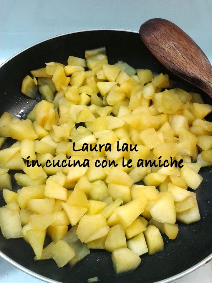 Metti le mele a pezzettini in una padella antiaderente con acqua (circa mezza tazzina), copri con zucchero di canna quantità a piacere, e cuoci a fuoco medio-alto senza coperchio finchè si ammorbidisce, senza però farla diventare troppo molle (aggiungere altra acqua se serve).