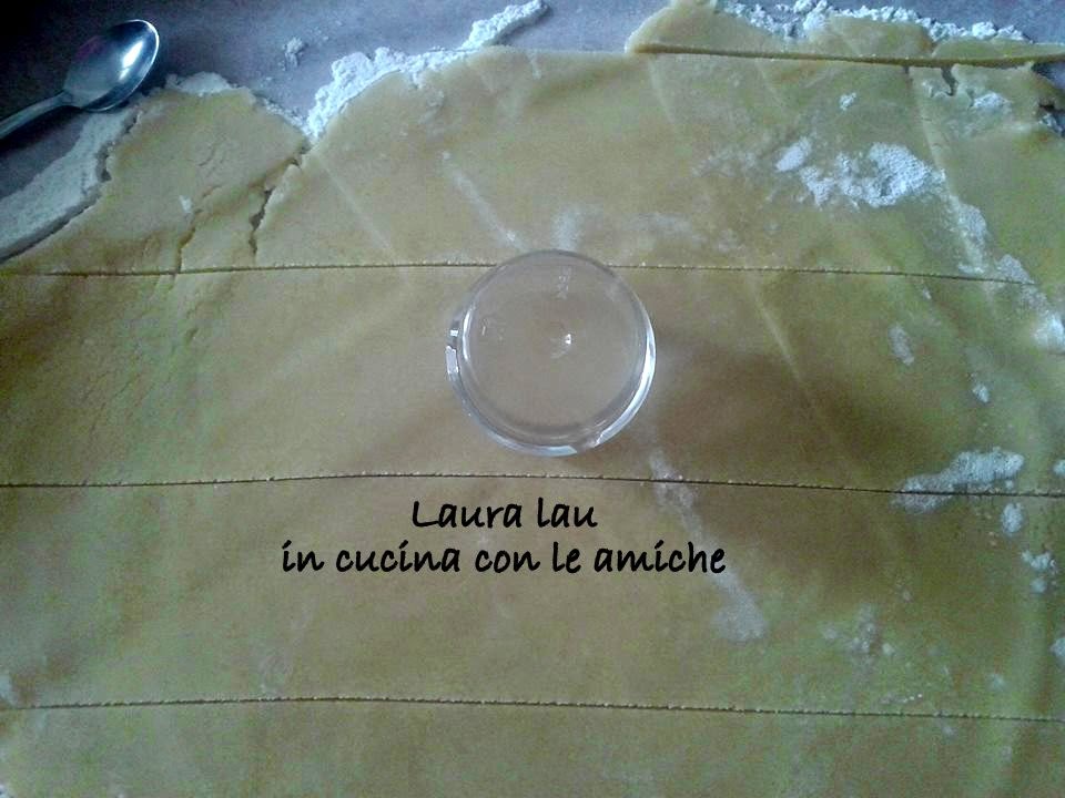 Taglia delle strisce abbastanza larghe, almeno 7 cm e con il misurino del Bimby o un utensile a forma di cerchio, segna la forma dei biscotti.