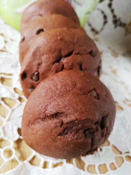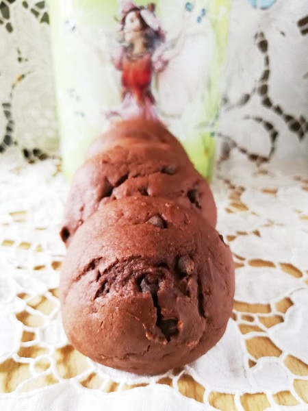 Io li ho preparati con l’ausilio del mixer, ma il trasferimento nella scodella ( ho aggiunto solo in ultima istanza le gocce di cioccolato) è stato laborioso.