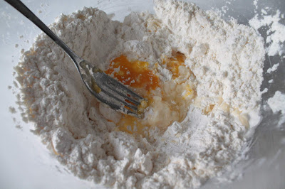 - Facciamo un buco al centro del composto e versiamo l’uovo. Mescoliamo con una forchetta fino a che l’uovo non sarà assorbito dalla farina.