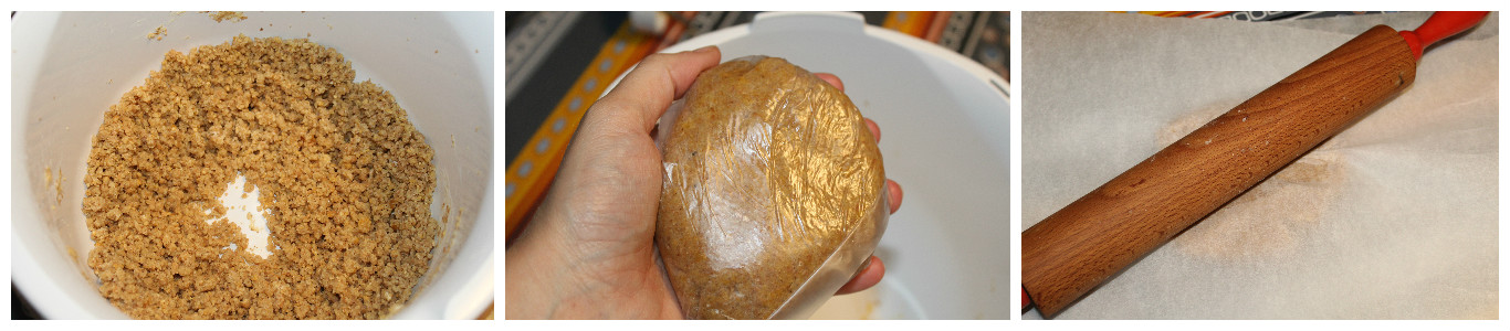 Lavorate tutti gli ingredienti nella planetaria, o in un robot da cucina fino ad ottenere un composto di briciole umide, trasferitele sul piano da lavoro impastatele a mano per qualche secondo fino ad ottenere una palla liscia, avvolgetela nella pellicola trasparente e fatela riposare in frigorifero per almeno 30 minuti prima dell’utilizzo.