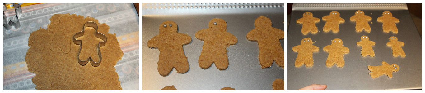 Stendete la pasta in una sfoglia di circa mezzo centimetro e ricavate tanti omini fino ad esaurimento della pasta frolla. Io ho utilizzato 2 stampi uno da 10 cm e uno da 8 cm. Disponeteli man mano su una placca da forno e create per ognuno una coppia di occhi con degli zuccherini, nel mio caso sono palline argentate.