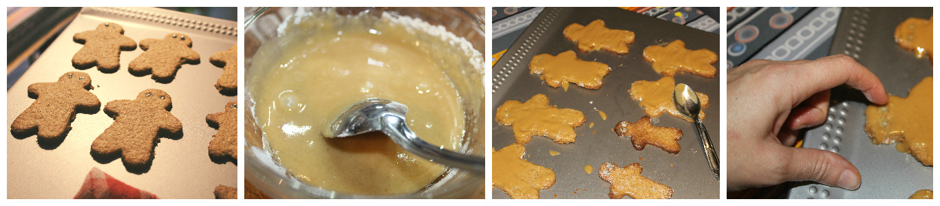 Ricoprite velocemente di glassa gli omini, non siate precisi in fondo sono omini della palude! Appena la glassa comincia a rapprendere, liberate gli occhi con le dita, otterrete un effetto “fangoso” in questo modo.