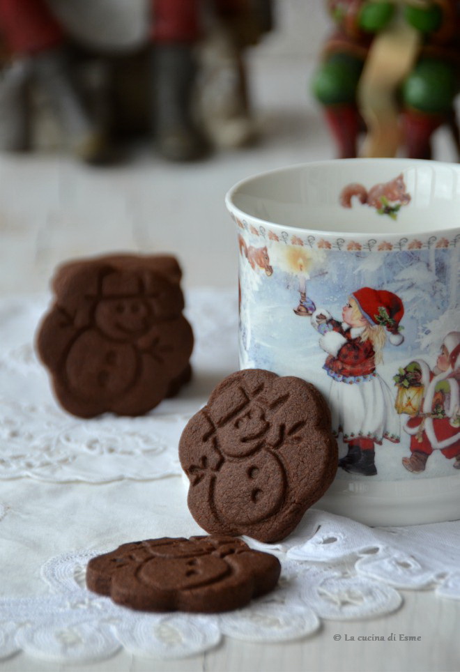 Preparate la frolla come preferite a mano o nel robot da cucina. Io ho utilizzato quest’ultimo. Utilizzando le lame del robot. frullate prima la farina con il burro e poi aggiungete il cacao, lo zucchero e il mix di spezie (cannella, zenzero, noce moscata e anice stellato) e frullate ancora. Poi seguitate unendo i tuorli d’uovo e l’acqua, frullate ancora fino a formare la classica palla. A questo punto prelevate l’impasto e lavoratelo qualche minuto a mano fino a formare un bel composto liscio, quindi avvolgetelo nella pellicola trasparente e mettere a riposare nel frigo per almeno un’ora. Trascorso il tempo di riposo, riprendete la frolla e stendetela su un piano tra due fogli di carta forno e tiratela con il mattarello fino a formare una sfoglia di circa 3/4 mm di spessore. Tagliate i biscotti della forma che più vi piace, quindi foderate una teglia con la carta forno e allineateli uno accanto all’altro. Cuoceteli nel forno già caldo in modalità areata a 180° per circa 15 minuti, quindi sfornate e lasciateli raffreddare su una gratella per dolci.