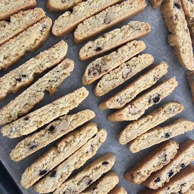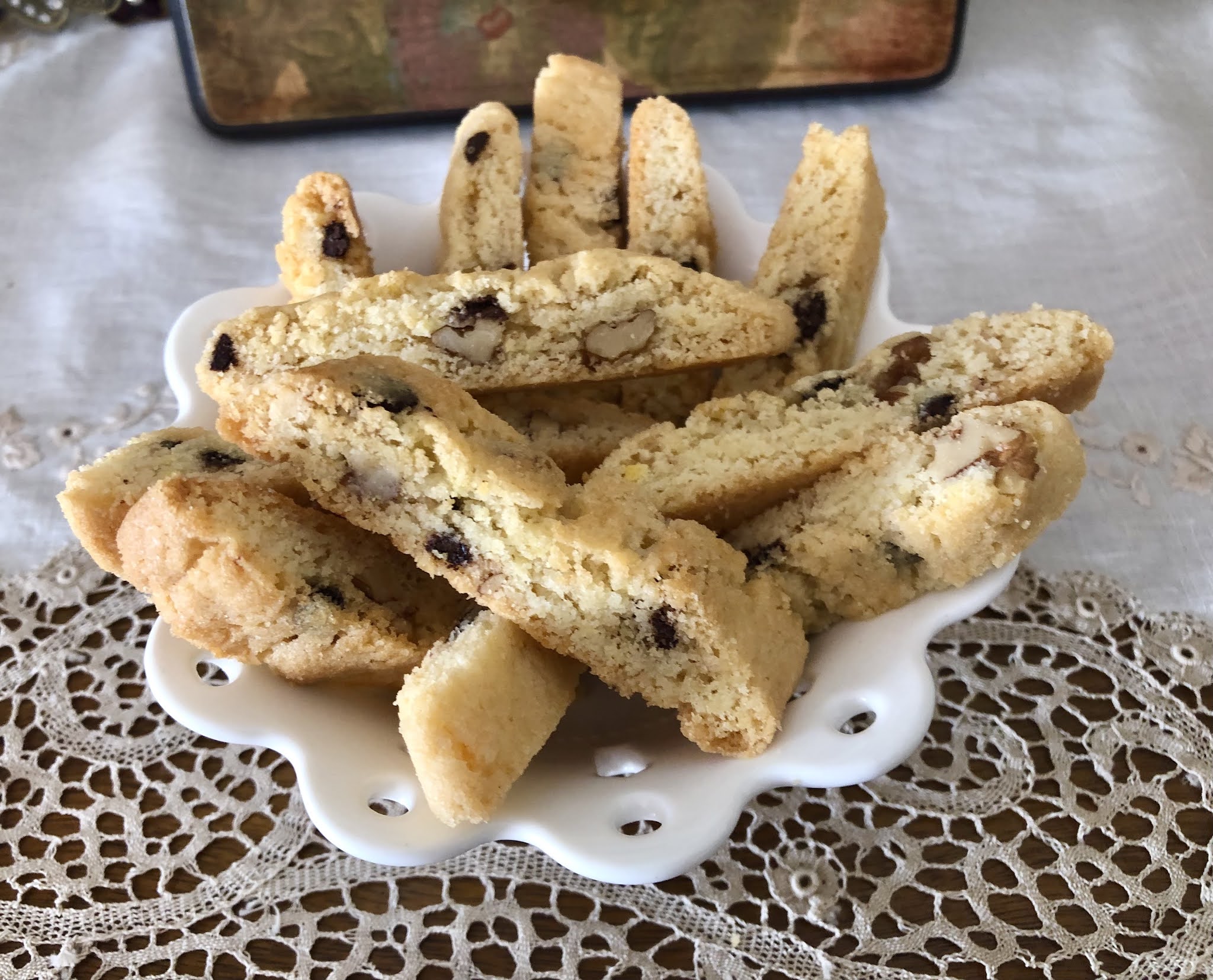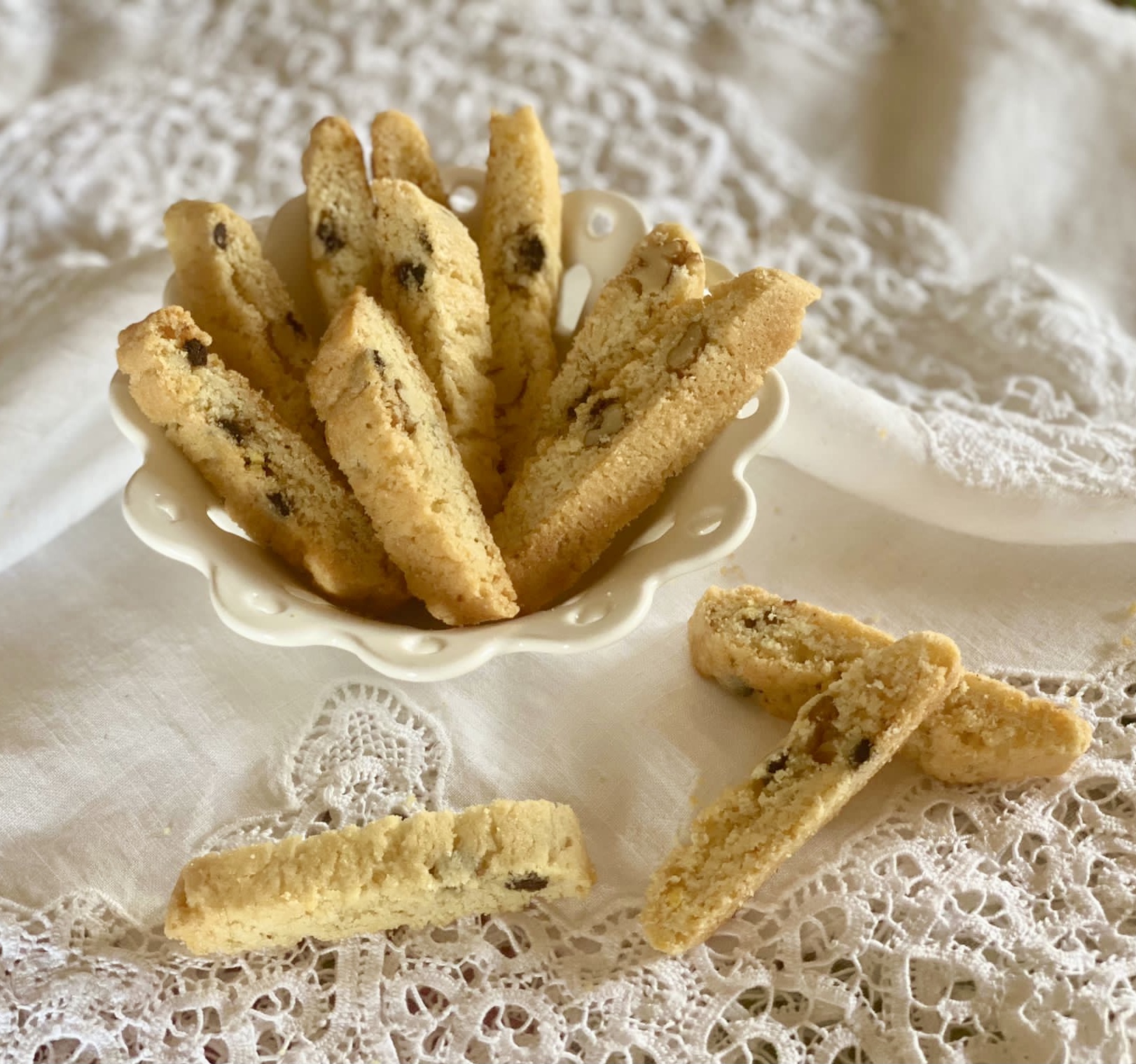 Cantucci per i toscani, tozzetti per gli umbri, per me soltanto biscotti, deliziosi da sgranocchiare a tutte le ore. Di norma fanno parte dei dolcetti natalizi, immancabili nel vassoio da regalare agli amici, nulla ci vieta comunque di prepararli quando ne abbiamo voglia.Quelli di oggi sono una delle tanti varianti, non mandorle ma noci e gocce di cioccolato fondente. Molto friabili, potrete inzupparli nel vino passito se vi piace, ma non sarà obbligatorio perchè sono così morbidi che si sciolgono in bocca.