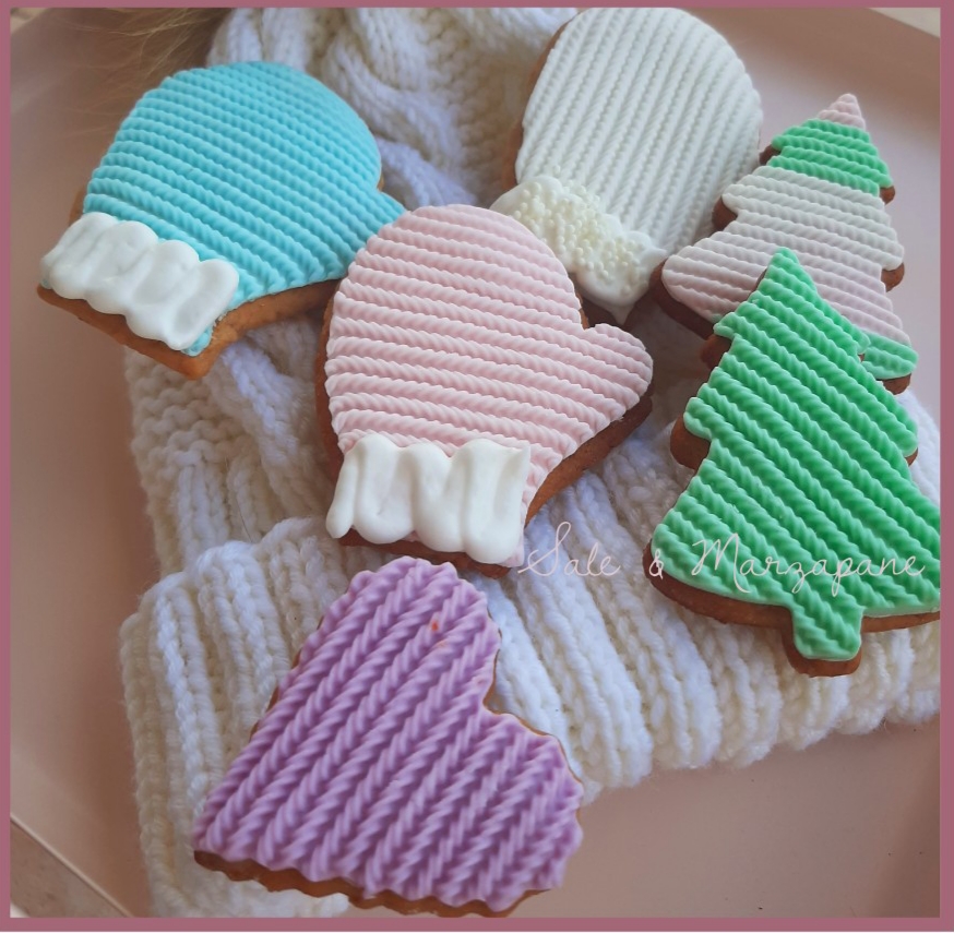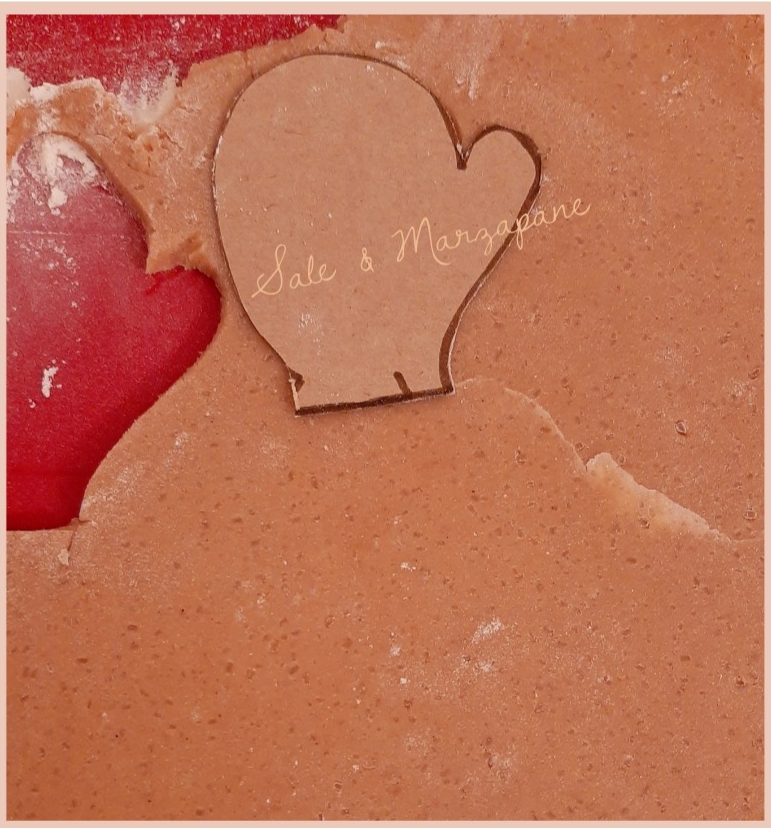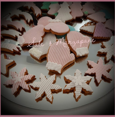 In alcuni biscotti ho utilizzato sia la pasta di zucchero per la copertura sia la ghiaccia per i dettagli dei guanti.