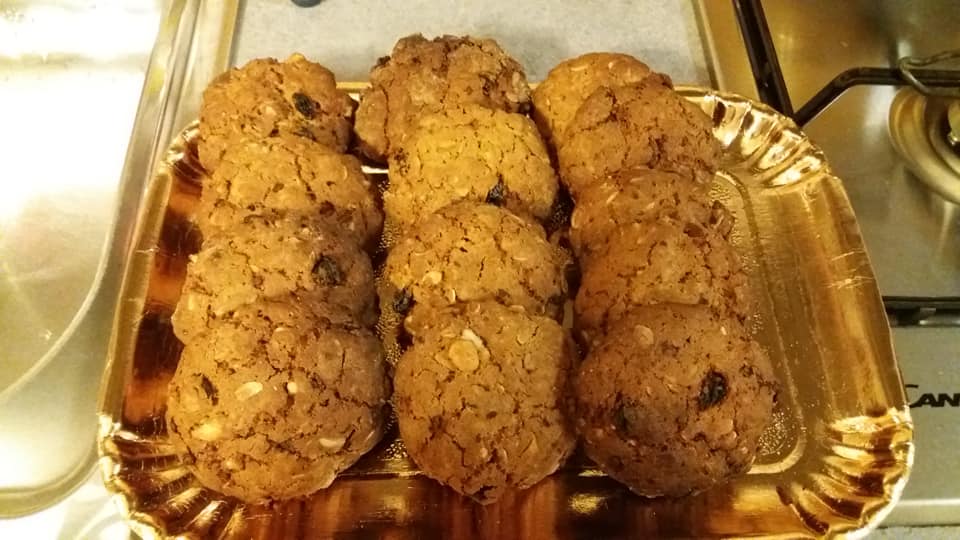 PREPARAZIONE : Mettere in una ciotola le farine, lo zucchero, i fiocchi d’avena, la frutta secca tritata grossolanamente, l’uvetta , l’uovo, l’olio, il latte , il lievito per dolci , l’aroma di arancia. Impastate bene con le mani tutti gli ingredienti fino a formare un panetto . Ricopritelo con la pellicola alimentare e mettetelo in frigo per circa 30 minuti. Passati i 30 minuti, riprendete l’impasto, formate dei cilindri e tagliate delle fette non troppo spesse circa 1 cm. Dategli una forma tonda e appiattiteli leggermente e metteteli in una teglia in forno già caldo a rivestita con carta da forno distanziateli perchè poi in cottura lieviteranno. Infornate i biscotti in forno già caldo a 180°C per 15/20 minuti. Dovranno dorarsi leggermente. Fate raffreddare prima di consumarli.