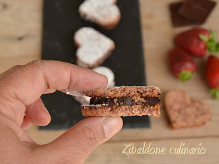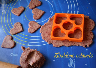 Togliere dal frigo attendere circa 5 minuti e poi rendere plastica la frolla con un leggero impasto, sfogliare con il mattarello allo spessore di circa 4mm, tagliare con le formine a cuore.