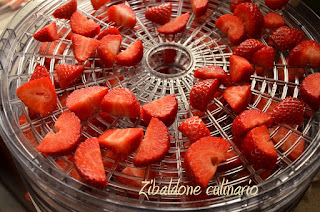 Lavare le fragole con il picciolo sotto acqua corrente, asciugarle e tagliare in 4, o 6 se fossero molto grandi, posizionarle nell’essiccatore e procedere con l’essiccazione per 12 ore.