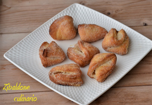 Avvolgere l’impasto nella pellicola raffreddare in frigo per circa un’ora. Riprendere l’impasto e con l’aiuto di un po’ di farina stenderlo ad uno spessore di circa 3mm. Tagliarli con un coppa pasta di circa 8cm di diametro, passarli nello zucchero da entrambi i lati (distribuire lo zucchero su un piatto piano) e poi ripiegarli come in foto, tipo crespella.