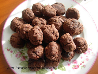 Frullare banana e mandorle, sciogliere il cioccolato a bagnomaria, impastare tutti gli ingredienti. Ottenere delle palline con le mani e distribuirle su una teglia con cartaforno. Cuocere in forno a 170° per 15 minuti.