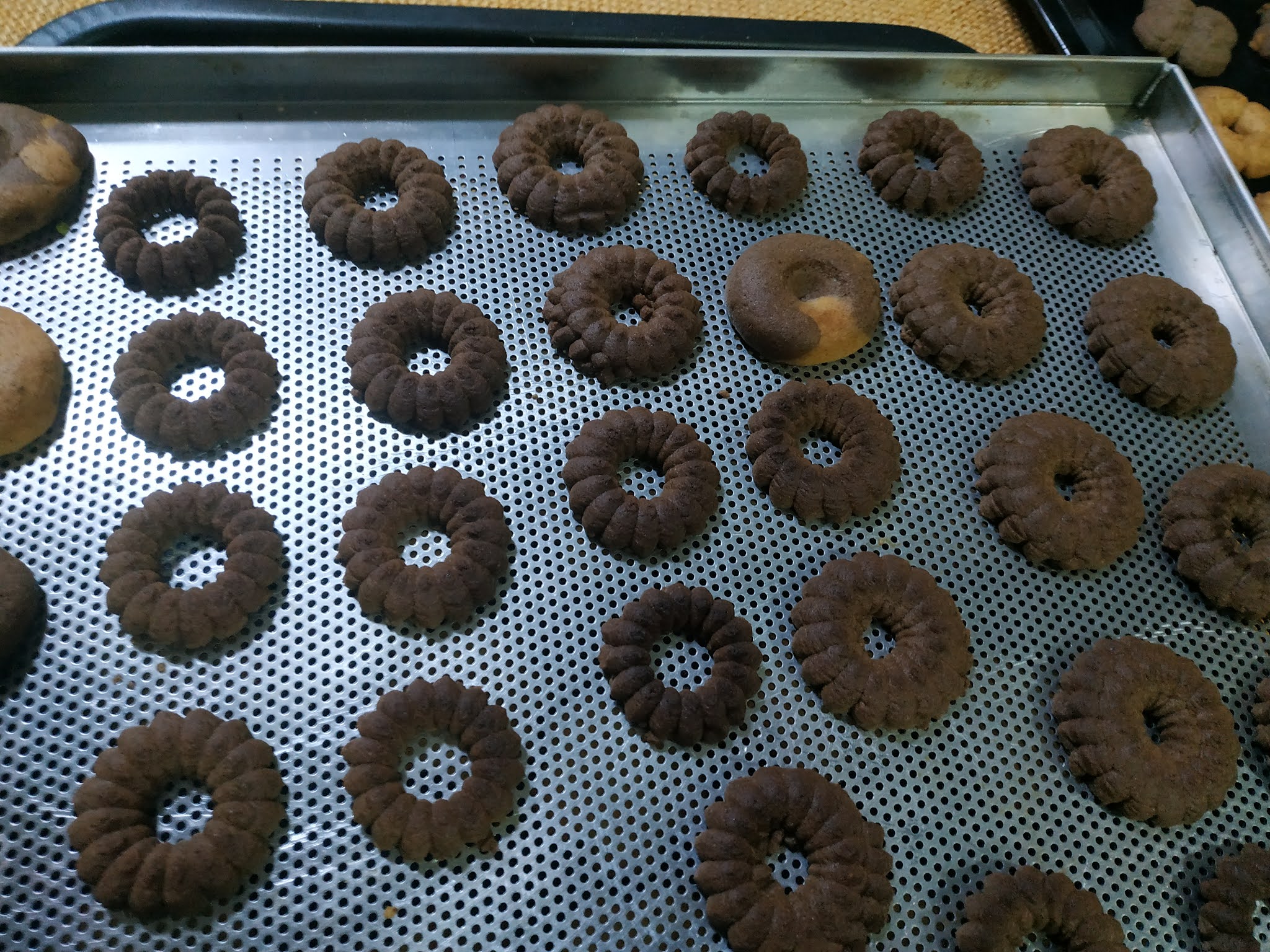 L’impasto, piuttosto morbido è ideale per la sparabiscotti. Impastate gli ingredienti (anche a mano), inserite l’impasto nell’attrezzo e formate i biscottini su una teglia non imburrata.