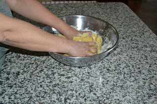 Mescolare tutti gli ingredienti in una ciotola capiente, fino ad ottenere un impasto omogeneo, senza lavorare troppo l’impasto: volendo si può mettere tutto nel mixer e procedere a scatti, per scaldare troppo l’impasto.