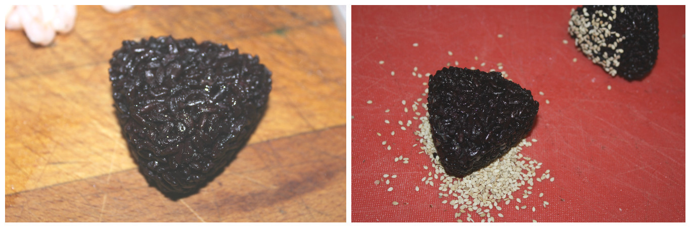 Procedete così fino ad esaurimento degli ingredienti. Decorate gli Onigiri con i semi di sesamo, ho provato anche ad utilizzare l’alga Nori ma essendo scura, non risaltava, quindi ho scelto di fare contrasto con il sesamo.