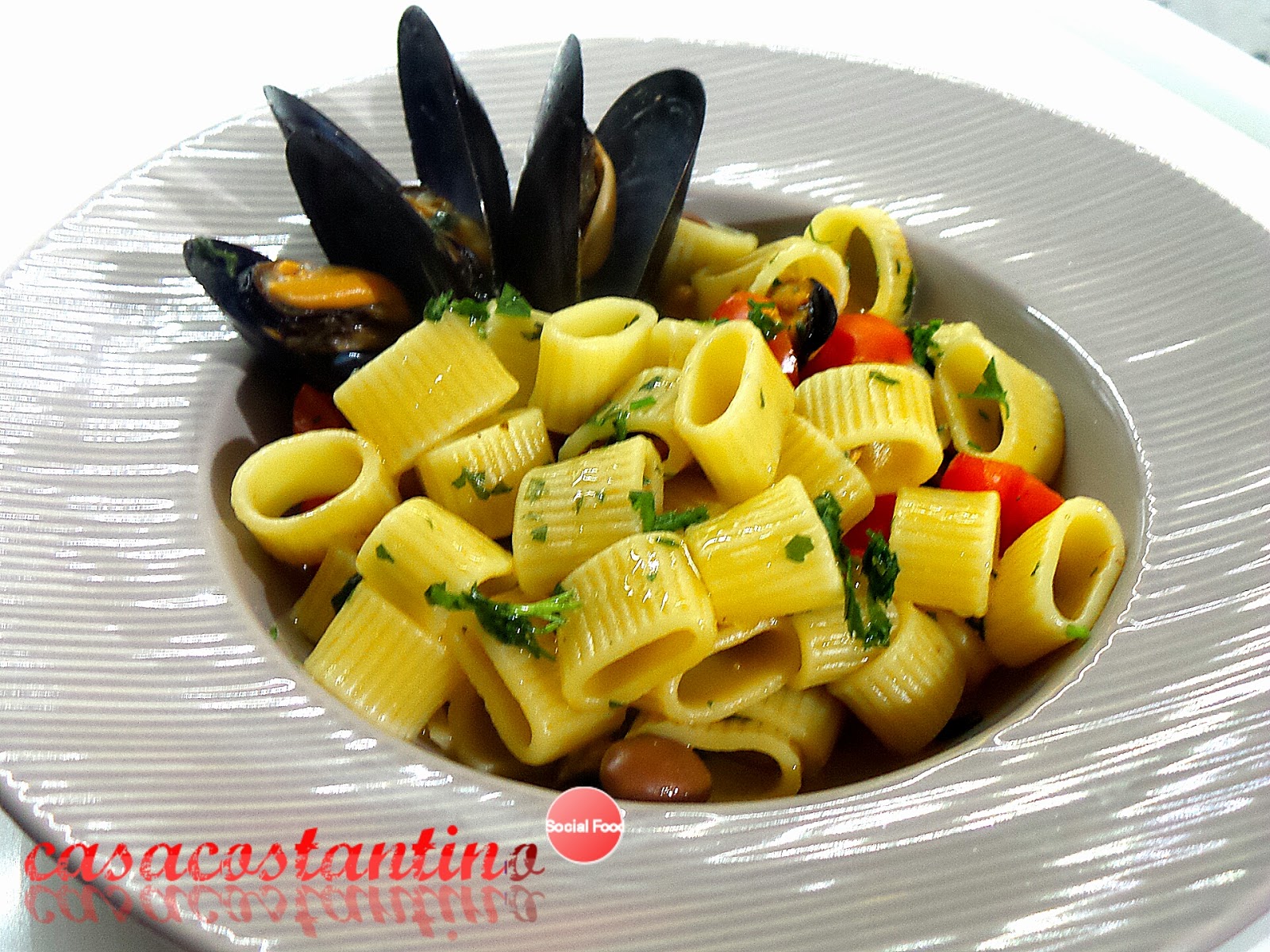 Versiamo un paio di mestoli di pasta per piatto, decoriamo con le cozze lasciate da parte e completiamo con un filo d’olio a crudo, una macinata di pepe ed un po’ di prezzemolo.