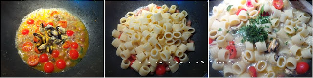 Facciamo passare altri 2′ quindi aggiungiamo le cozze che avremo provveduto a sgusciare (teniamone qualcuna intera da parte per l’impiattamento) ed un mestolo di acqua di cottura di quest’ultime e facciamo cuocere per altri 2′. Scoliamo la pasta molto al dente ed aggiungiamola al condimento e terminiamone la cottura aggiungendo un mestolo di acqua di cottura della pasta ed uno di acqua di cottura delle cozze e continuiamo così secondo le esigenze. Aggiungiamo una presa di prezzemolo e lasciamo cuocere fin quando non avremo mantecato per bene la nostra pasta.