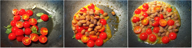 Appena pronto aggiungiamo il ciliegino tagliato a metà ed il basilico spezzato a mano e lasciamo cuocere per 2′. Trascorso il tempo di cottura, aggiungiamo i fagioli precedentemente lessati in acqua unitamente ad un mestolo di acqua di cottura della pasta.