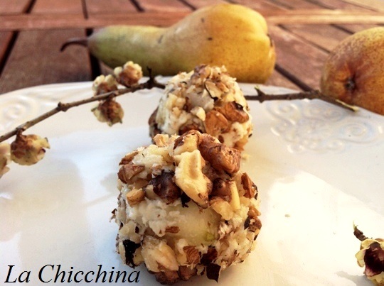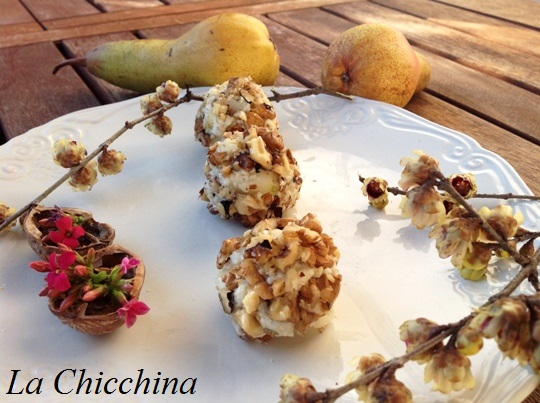 Formare delle palline grandi come grosse noci e rotolarle nella ciotolina con i gherigli, premendo leggermente perchè questi ultimi aderiscano.