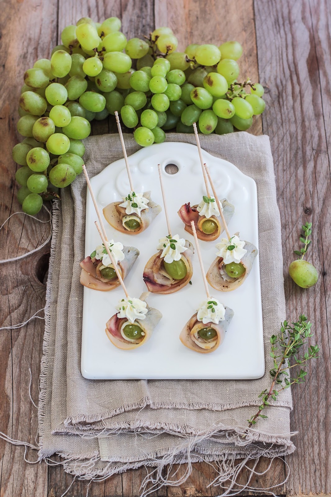 Posizionate al centro un chicco d’uva ed arrotolatele con garbo affinché si crei un bocconcino di gradevole aspetto.