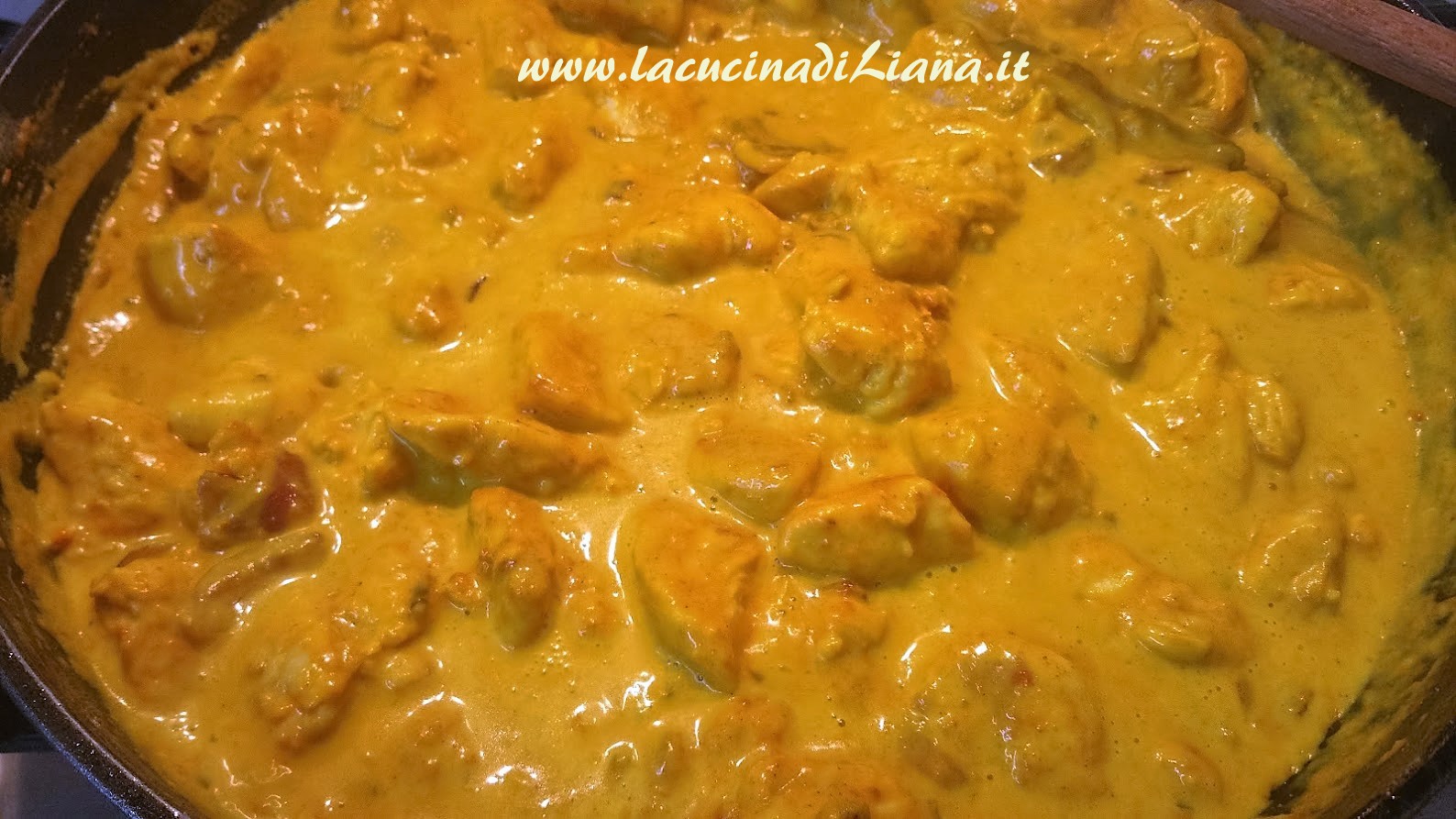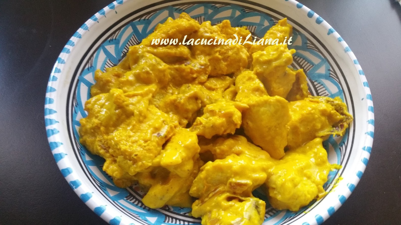 Tritare la cipolla e rosolarla in poco olio nella solita padella, aggiungere il pollo, quindi bagnarlo con il latte e con la panna, aggiungere il cucchiaio di curcuma, sale e pepe, abbassare la fiamma e portare a cottura la carne, ci vorranno circa 15 minuti se i bocconcini sono piccoli. A fine cottura aggiungere i funghi, la pancetta e la menta tritata.