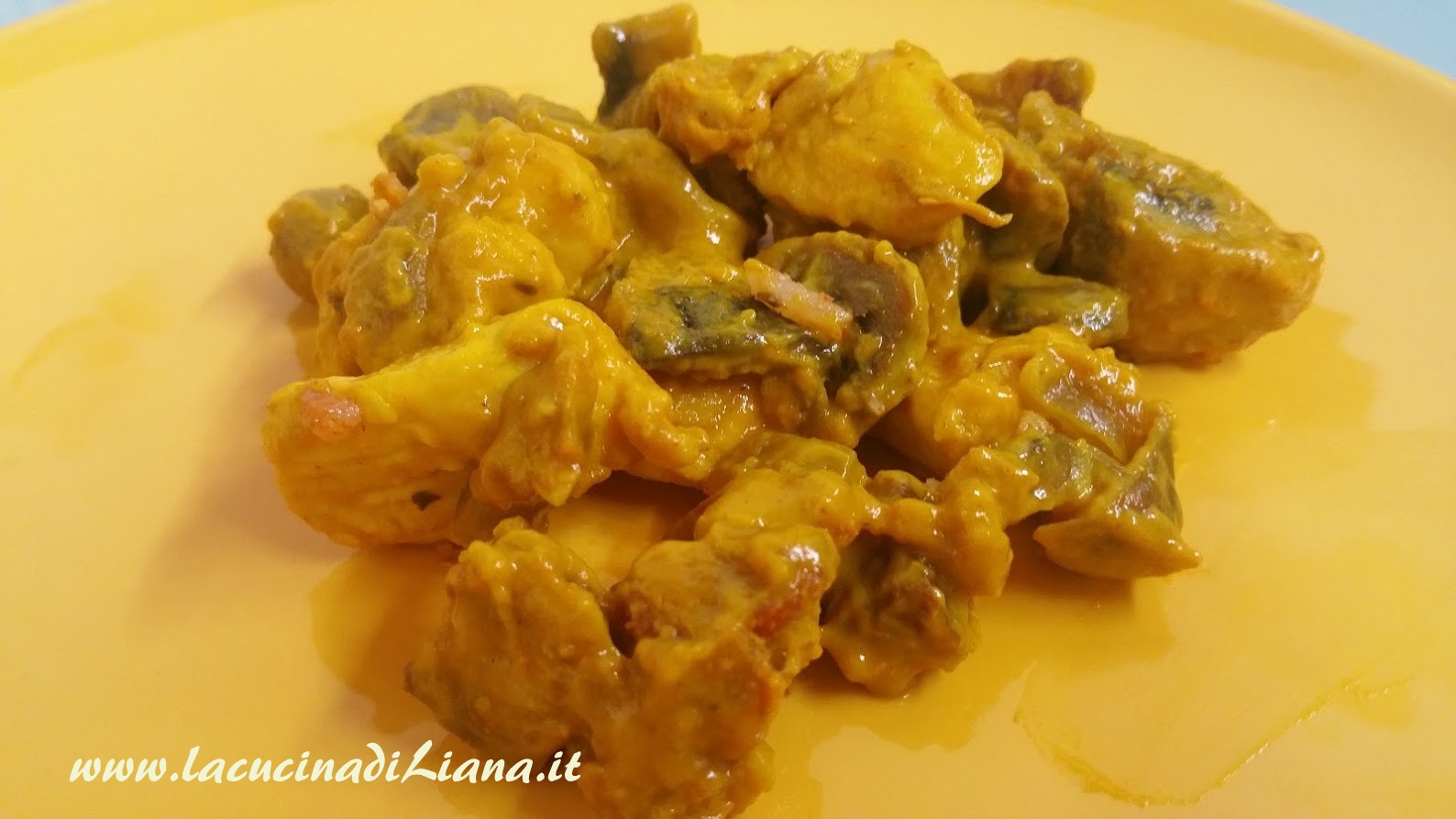 Ricetta buonissima per un secondo a base di Pollo, con pancetta croccante, funghetti trifolati e una prelibata salsa a base di panna e curcuma.