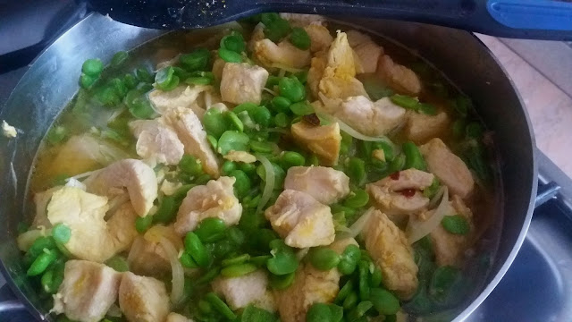 In un capente tegame,cipolla,fave,olio,sale,pepe e mezzo bicchiere di acqua,