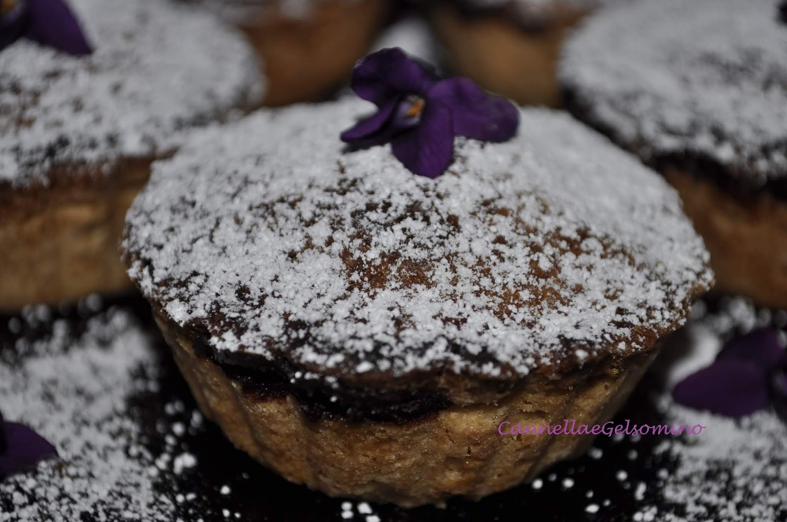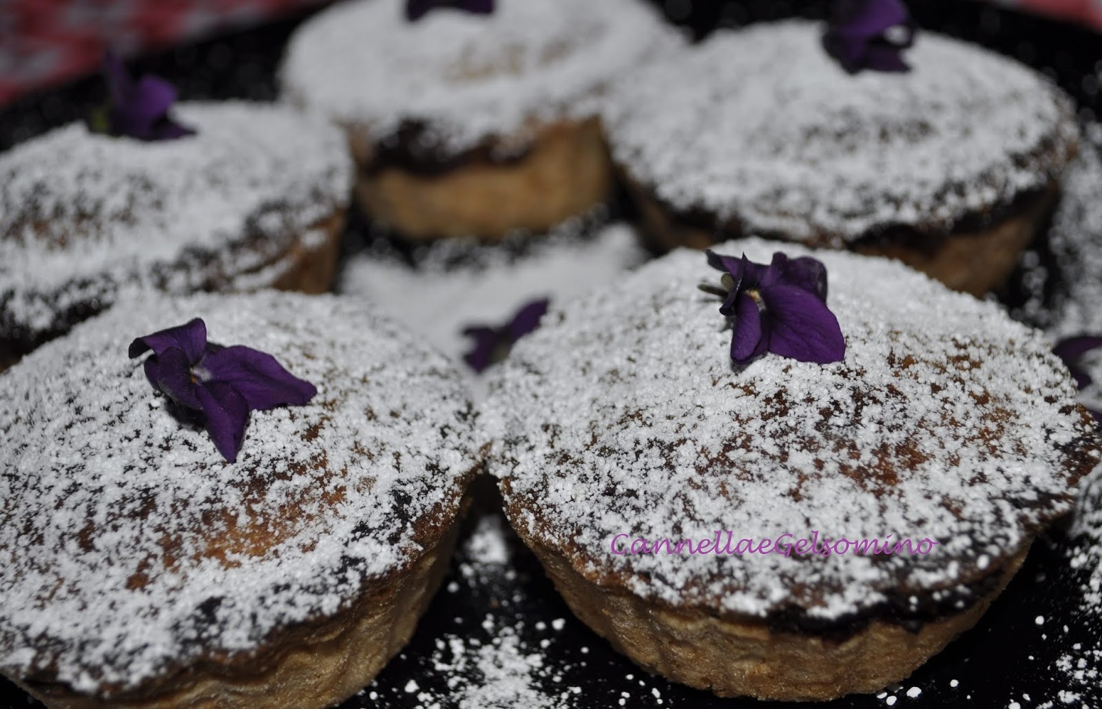 Ogni anno mi diverto a sperimentare qualcosa con questi umili fiorellini: oggi ho preparato dei bocconotti di pasta frolla ripieni di pere e cioccolato, profumati con uno zucchero a velo alle violette.