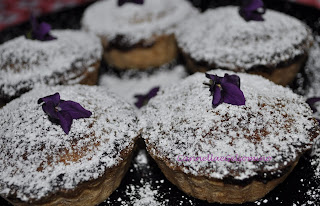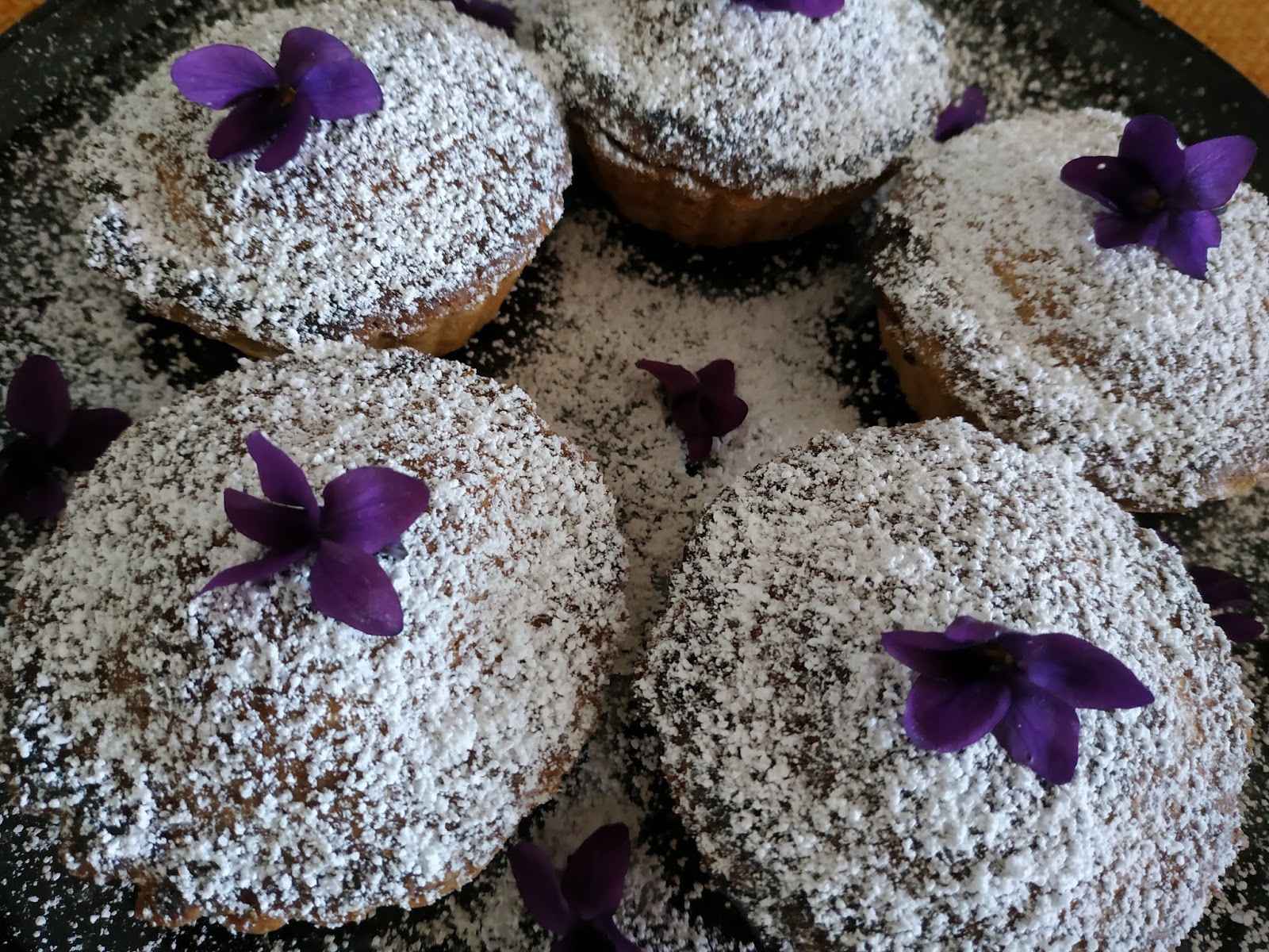 Mettiamoli su un vassoio e spolverizziamo con il nostro meraviglioso zucchero a velo; decoriamo con delle violette fresche e voilà!