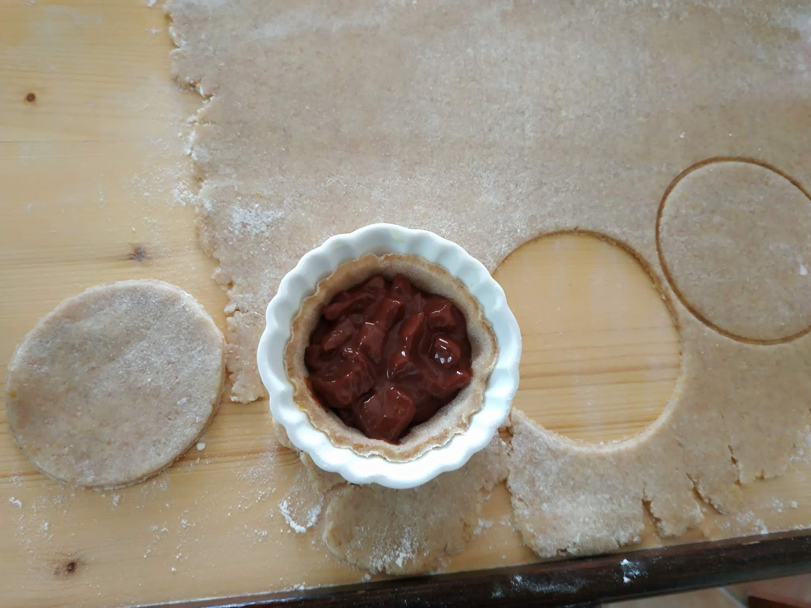 Stendiamo la frolla con il mattarello infarinando leggermente perchè non si attacchi. Ritagliamo con un coppapasta dei cerchi della misura giusta per foderare gli stampini che abbiamo (vanno bene quelli da tartellette anche se ovali). Mettiamo un cucchiaio di ripieno allinterno e chiudiamo con un altro cerchio di pasta, sigillando bene i bordi.