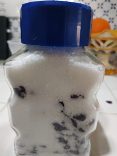 La nevicata bianca che profumerà i dolcetti va preparata alcuni giorni prima, per dare il tempo allo zucchero di assorbire bene tutto il profumo che emanano le violette. Raccogliamo di mattina, dopo che è asciugata la rugiada, le violette, tagliamo via i gambi e mettiamole in un barattolo di vetro con zucchero semolato. Ogni tanto andiamo a scuotere il barattolo; dopo almeno una settimana, potremo preparare lo zucchero a velo, mettendolo in un frullatore con un cucchiaio (in 100 g di zucchero) di farina di riso (risulterà molto più impalpabile).