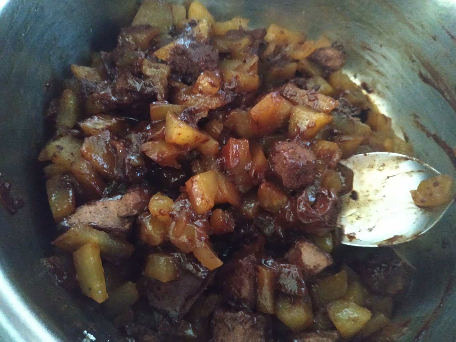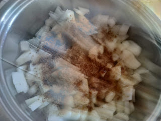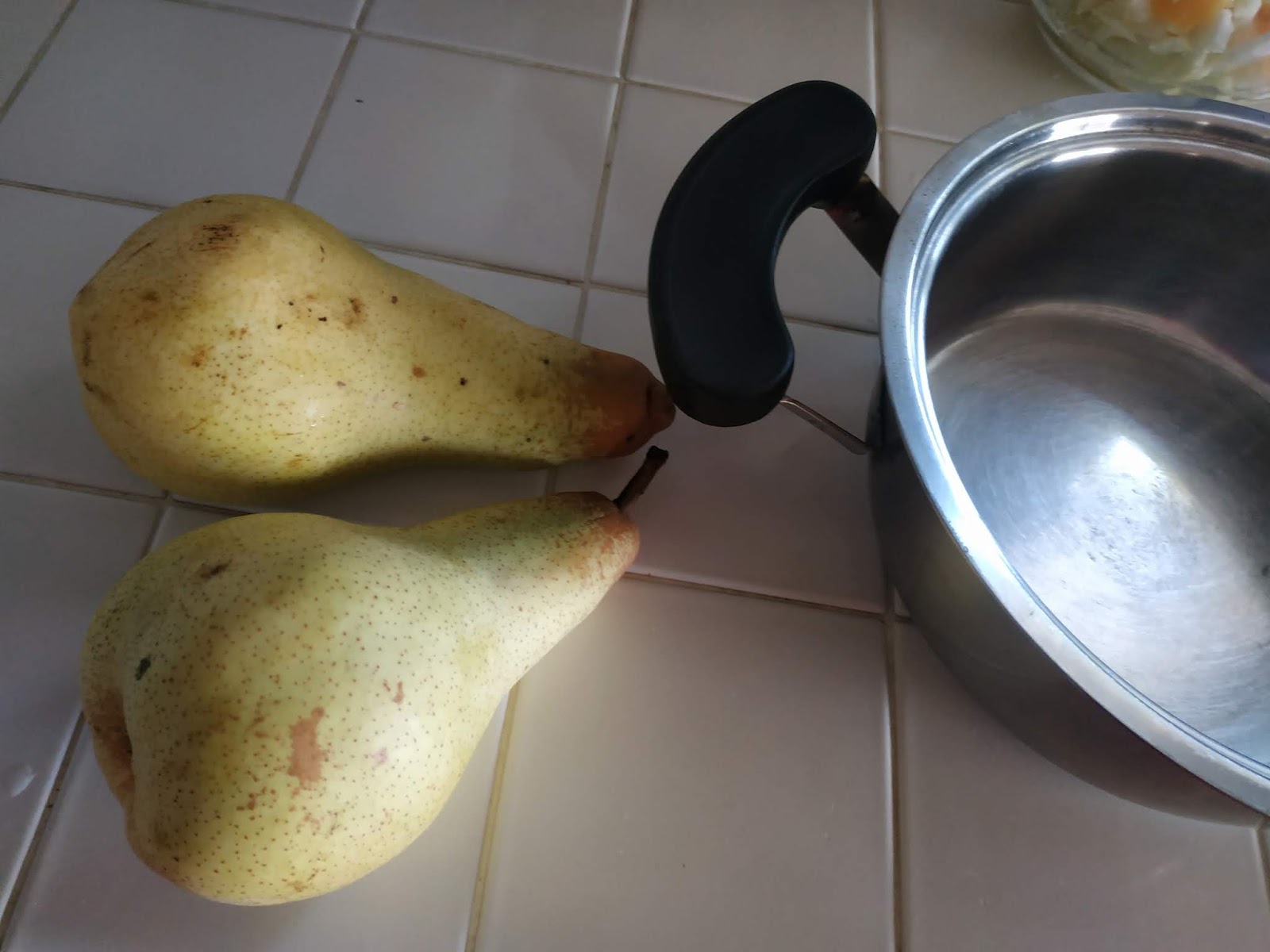 Per il ripieno dei bocconotti, tagliamo a dadini, dopo averle sbucciate, due grosse pere tipo abate; aggiungiamo 50 g di zucchero integrale di canna e facciamolele ammorbidire in un pentolino a fuoco basso.