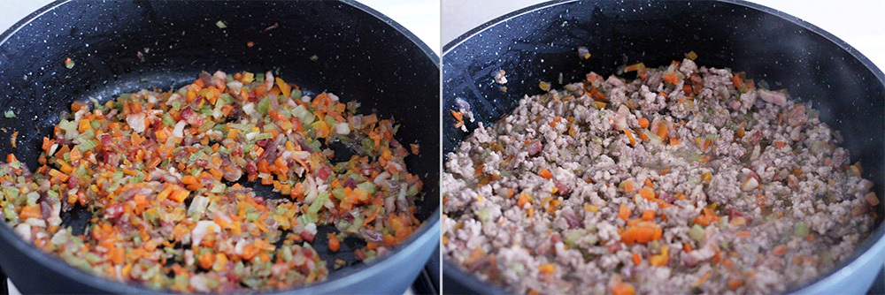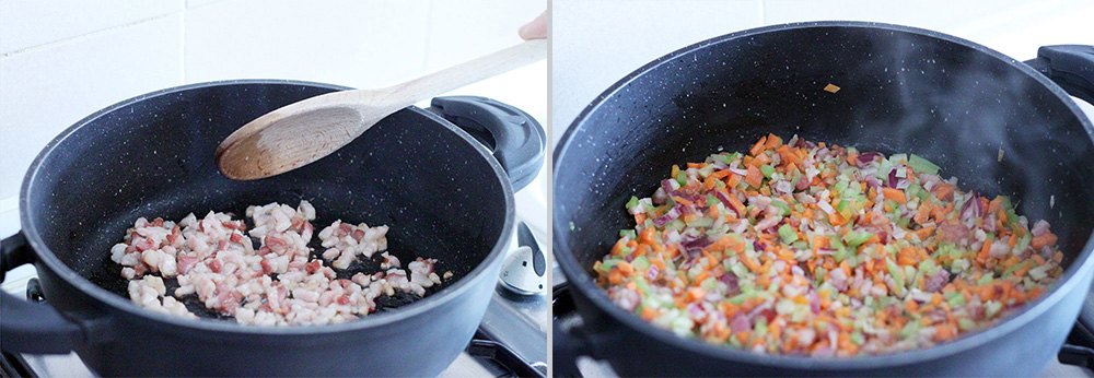 Grab a large pot, pour two tablespoon of olive oil and the chopped pancetta. When the pancetta gets almost transparent, add the chopped vegetables. Turn the heat on low and go on simmering, putting the lid on.