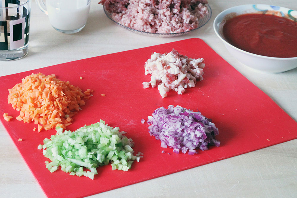 English. Let’s start with the vegetables. Clean, wash, wipe up and finely chop the vegetables. Chop the pancetta. Mix the tomato paste with water (not necessary if you chose canned tomatoes or passata).