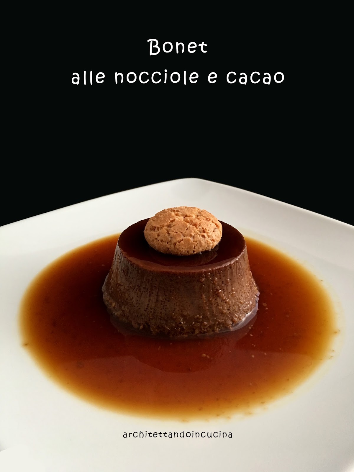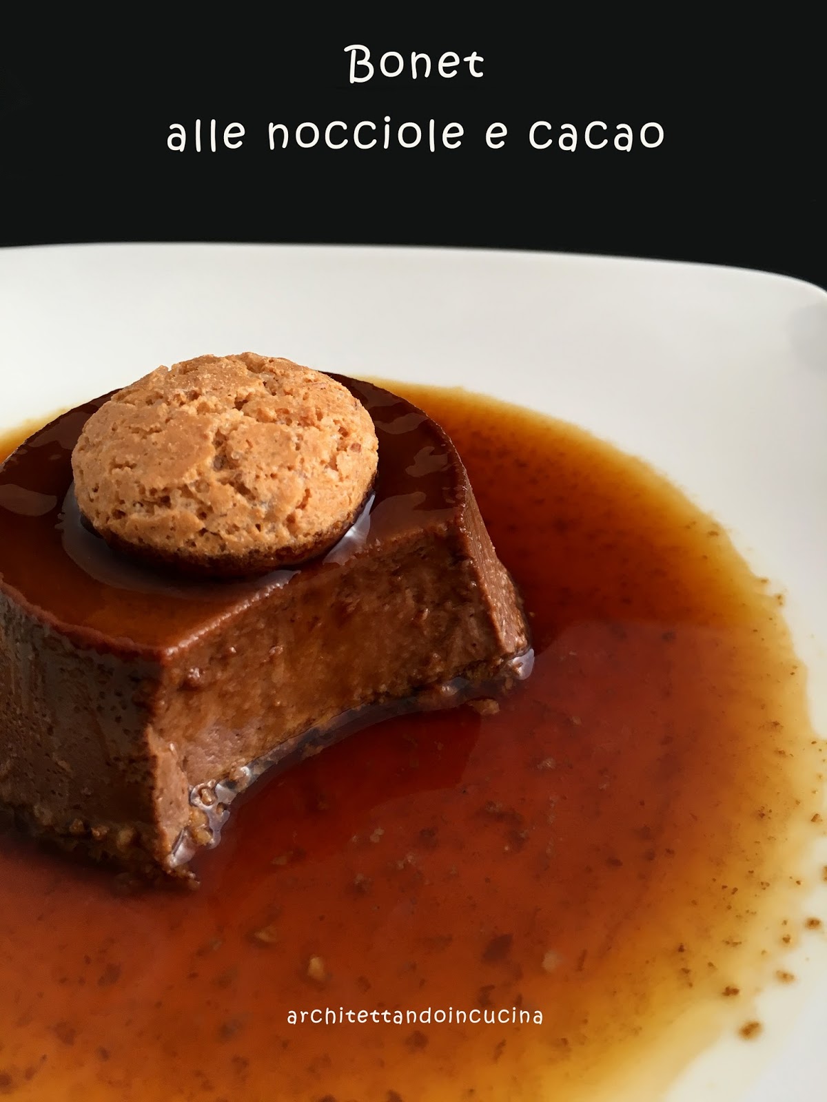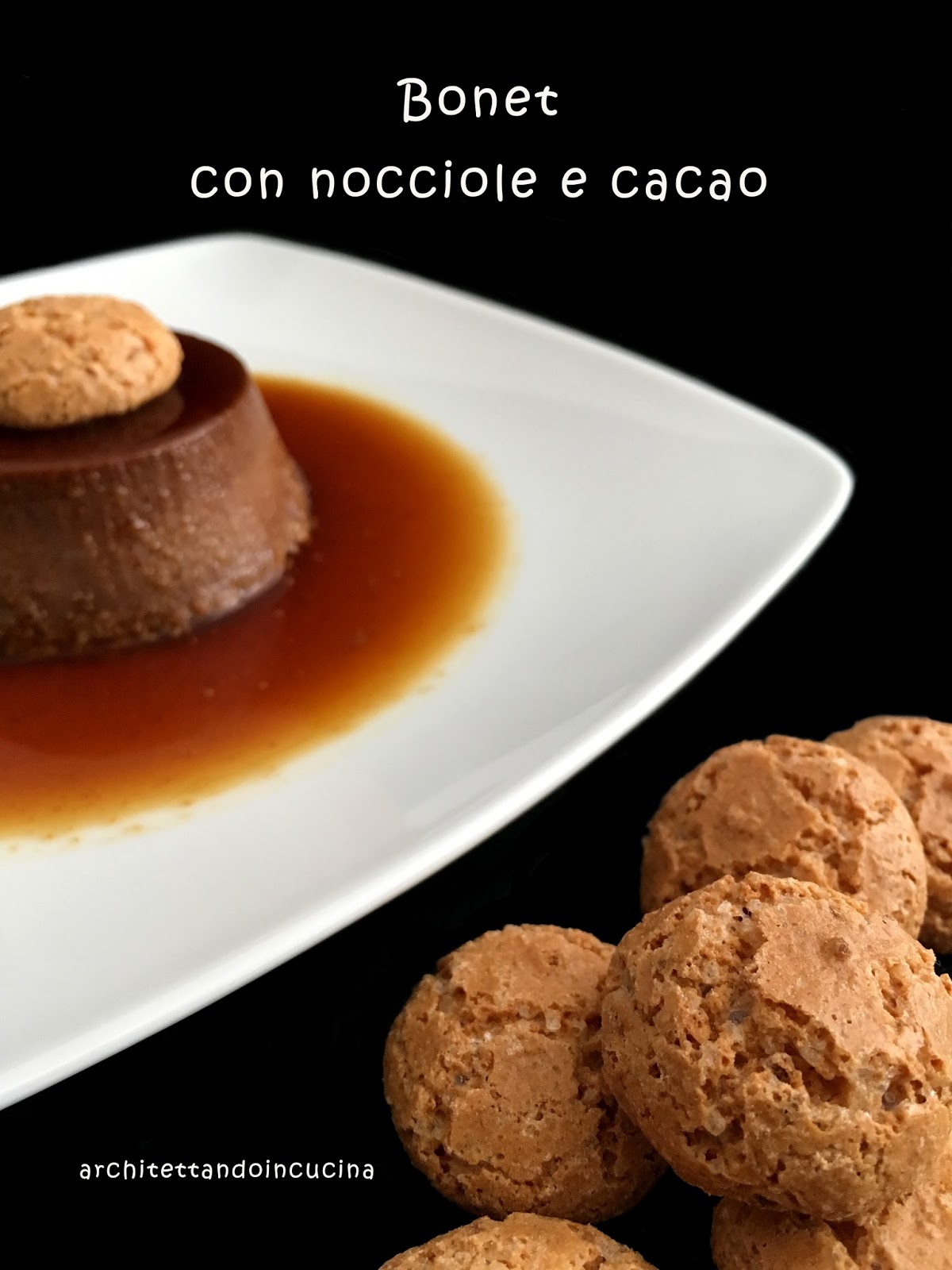 Questa ricetta, nasce da un clamoroso errore. Avevo ospiti a cena ed ho deciso di fare il bonet perchè è un dolce facile, non ti incasina tutta la cucina, si prepara in anticipo, ed è buonissimo. Per cui mi metto all’opera con le due ricette must: quella alle nocciole (che trovate qui) o quella classica al cacao (che è qui). Vi sarete già immaginati ciò che è successo: guardando le ricette e cercando di decidere quale mi piaceva di più (mission impossible), ho fatto un mix del tutto involontariamente ed il risultato è stato talmente buono, che poi l’ho rifatto più volte in questa terza versione, che pubblico oggi per la giornata del Bonet del Calendario del cibo Italiano.