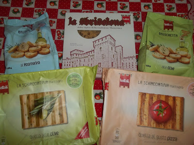 Bruschette al rosmarino e olive; in comode confezioni. Il pane viene tostato lentamente per renderlo friabile e leggero e poi insaporito all’olio di oliva.