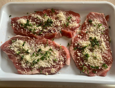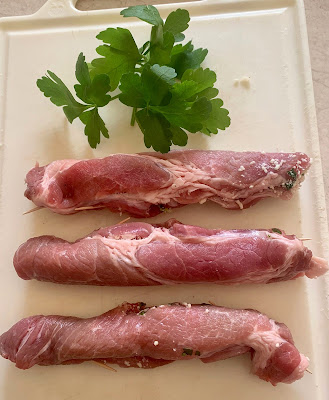 Battete le fettine tra due fogli di carta forno. Cospargete ogni fettina con pecorino grattugiato, prezzemolo e aglio tritati e un pò di pepe e sale. Arrotolate la carne e stringetela formando un involtino. Fermate con degli stecchini oppure con dello spago da cucina.
