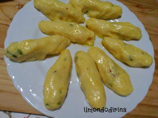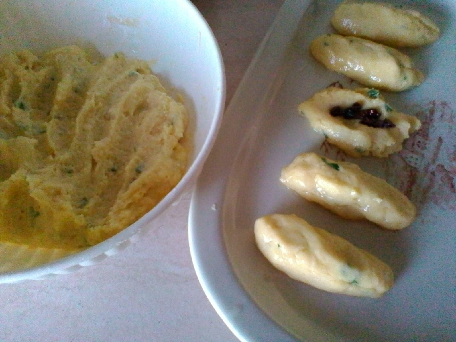 Lessate le patate in acqua salata, sbucciatele quando sono ancora calde e passatele allo schiacciapatate. Mettete il purè ottenuto in una ciotola e unitevi il pecorino, il prezzemolo tritato, le uova e farina quanto basta per avere un impasto omogeneo. Lasciate riposare l’impasto e nell’attesa prendete dei pomodori secchi e tagliateli a listarelle. Bagnatevi adesso le mani con l’olio, prendete un pò d’impasto, allargatelo sul palmo della mano e poggiate il pomodoro secco.