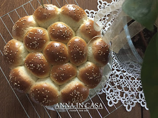 Una volta che l’impasto ha raddoppiato il suo volume, trasferirlo sulla spianatoia e ricavare 16 pezzi possibilmente dello stesso peso. Formare dei paninetti e posizionarli in una tortiera da 26 cm di diametro foderata con carta forno. Coprire e lasciare lievitare il tempo che il forno si scaldi a 180°C.