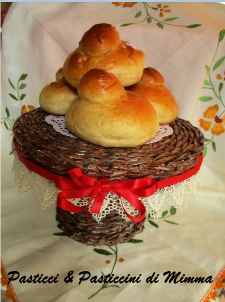 - arrotondare le brioche e poggiarle su una teglia con carta forno, spennellarle abbondantemente con tuorlo diluito con un pò di latte, fare una pressione al centro con il pollice per creare il buco dove andremo a collocare il “tuppo” modellato a goccia in modo che la punta entri dentro il foro della brioche.