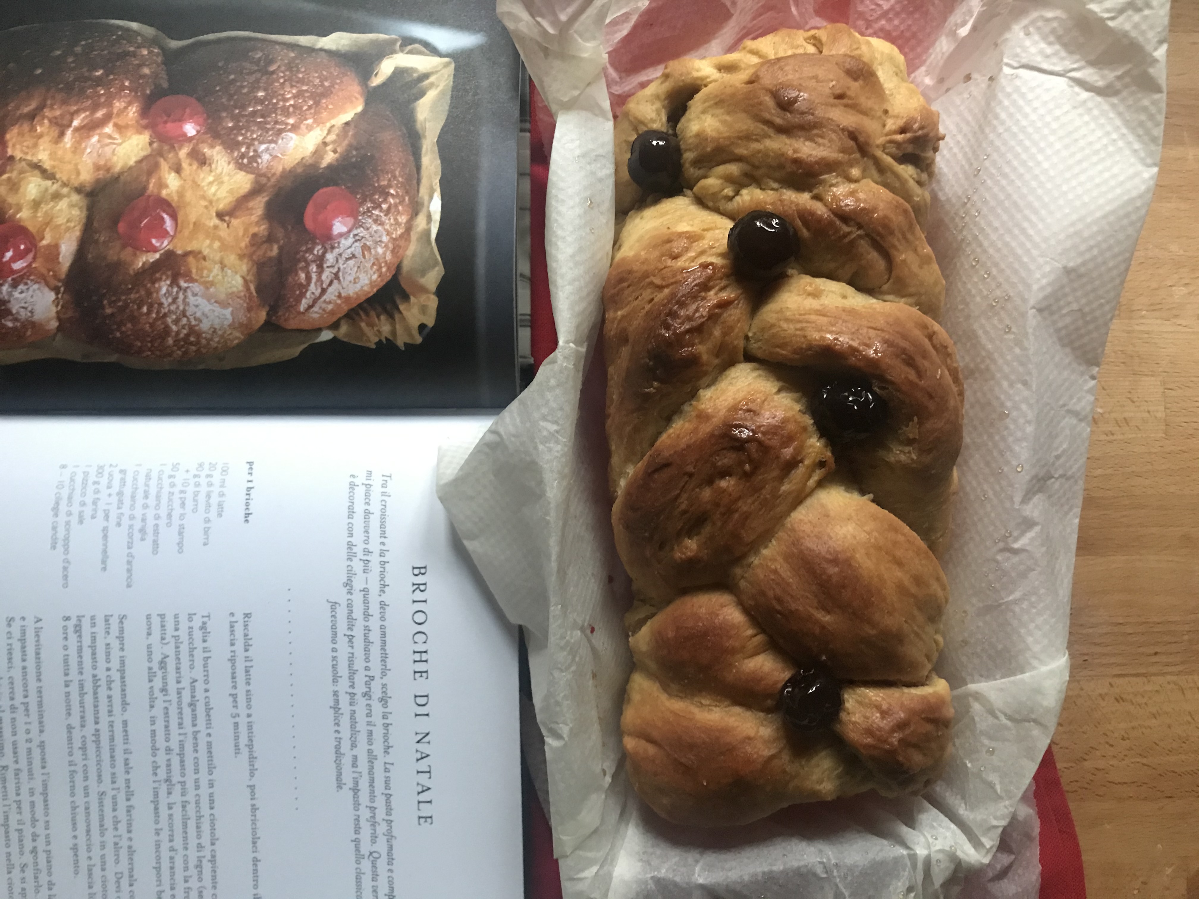 Sciogliere il lievito nel latte già tiepido e lasciarlo riposare qualche minuto. Con l’ausilio di un’impastatrice mescolare insieme gli ingredienti avendo cura di mettere prima gli ingredienti liquidi e dopo quelli solidi. Il burro va aggiunto a temperatura ambiente, molto morbido. Terminato l’impasto lasciarlo lievitare in una ciotola per circa 8 ore. Conclusa la lievitazione prendere l’impasto e lavorarlo a mano ancora per qualche minuto così da sgonfiarlo. L’impasto dovrà essere piuttosto appiccicoso. Dopodiché dividere l’impasto in tre parti e ad ogni pezzo dare una forma allungata così poi da formare una treccia. Gli estremi della treccia ripiegarli sotto. Infornare a 180 gradi per circa 20/25 minuti. Ancora caldo spennellare la superficie con sciroppo d’acero e guarnire con le amarene.