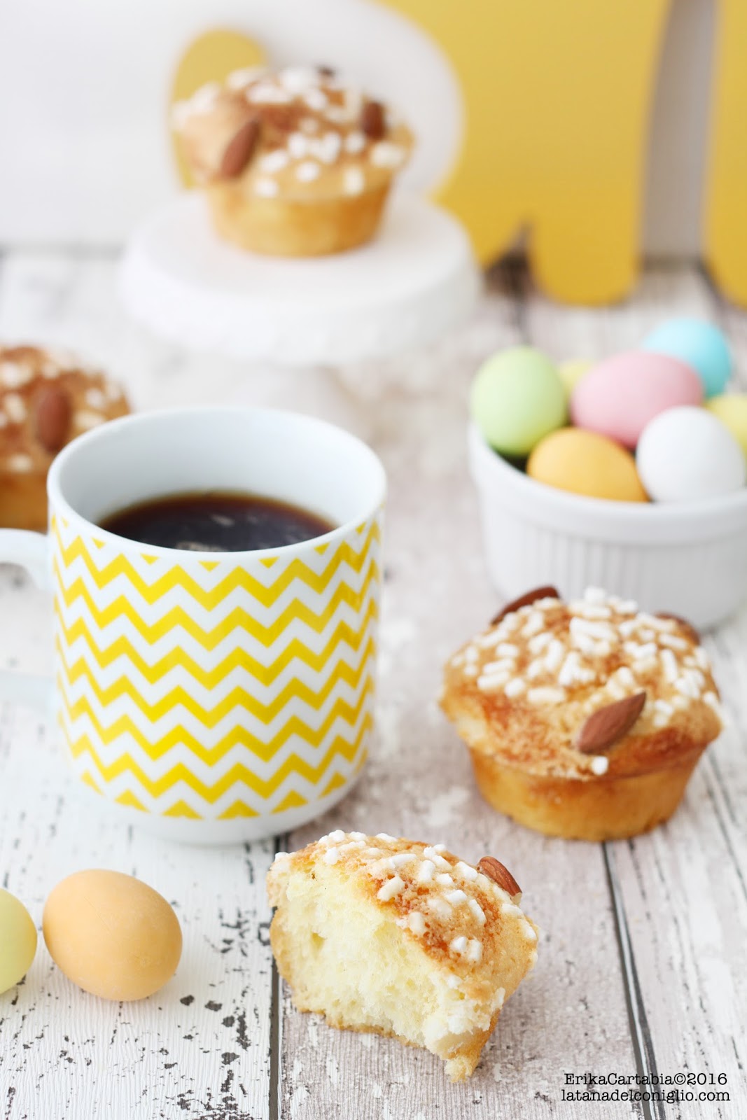 Non appena le vostre brioche saranno raddoppiate di volume versate un cucchiaio di glassa sulla superficie e completate con granella di zucchero e mandorle intere.