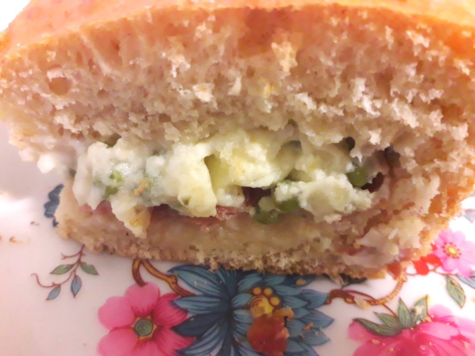 meta’ piselli,besciamella,caciocavallo tritato e i restanti piselli.Spennellare il bordo dell’impasto con albume e coprire il tutto con la restante pasta.Lasciare a rilievitare coperto,ancora 1 ora .