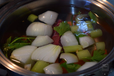 Sbucciate la cipolla e le carote e tagliatele in grossi pezzi. Lavate il sedano e tagliatelo a pezzi.