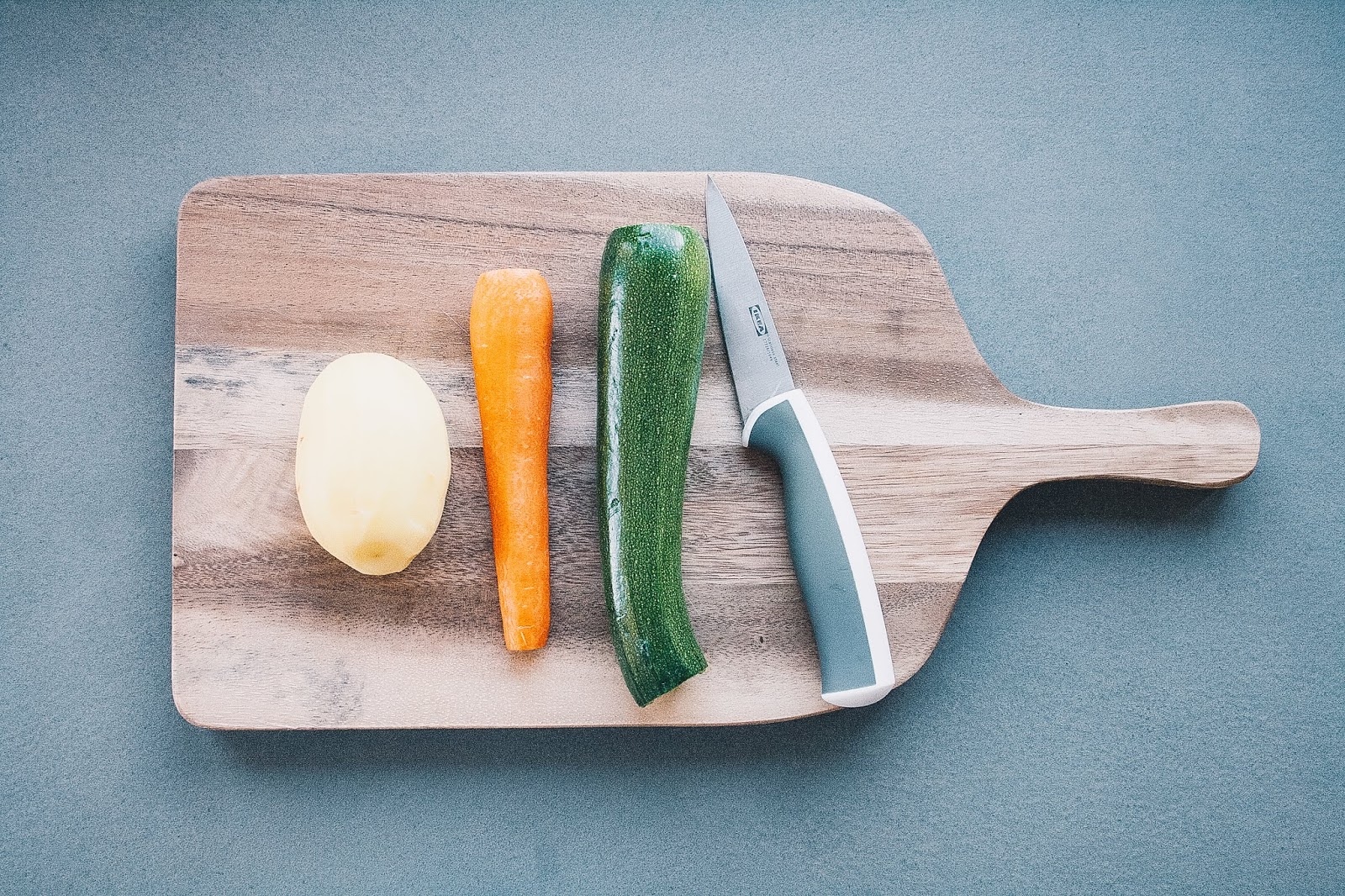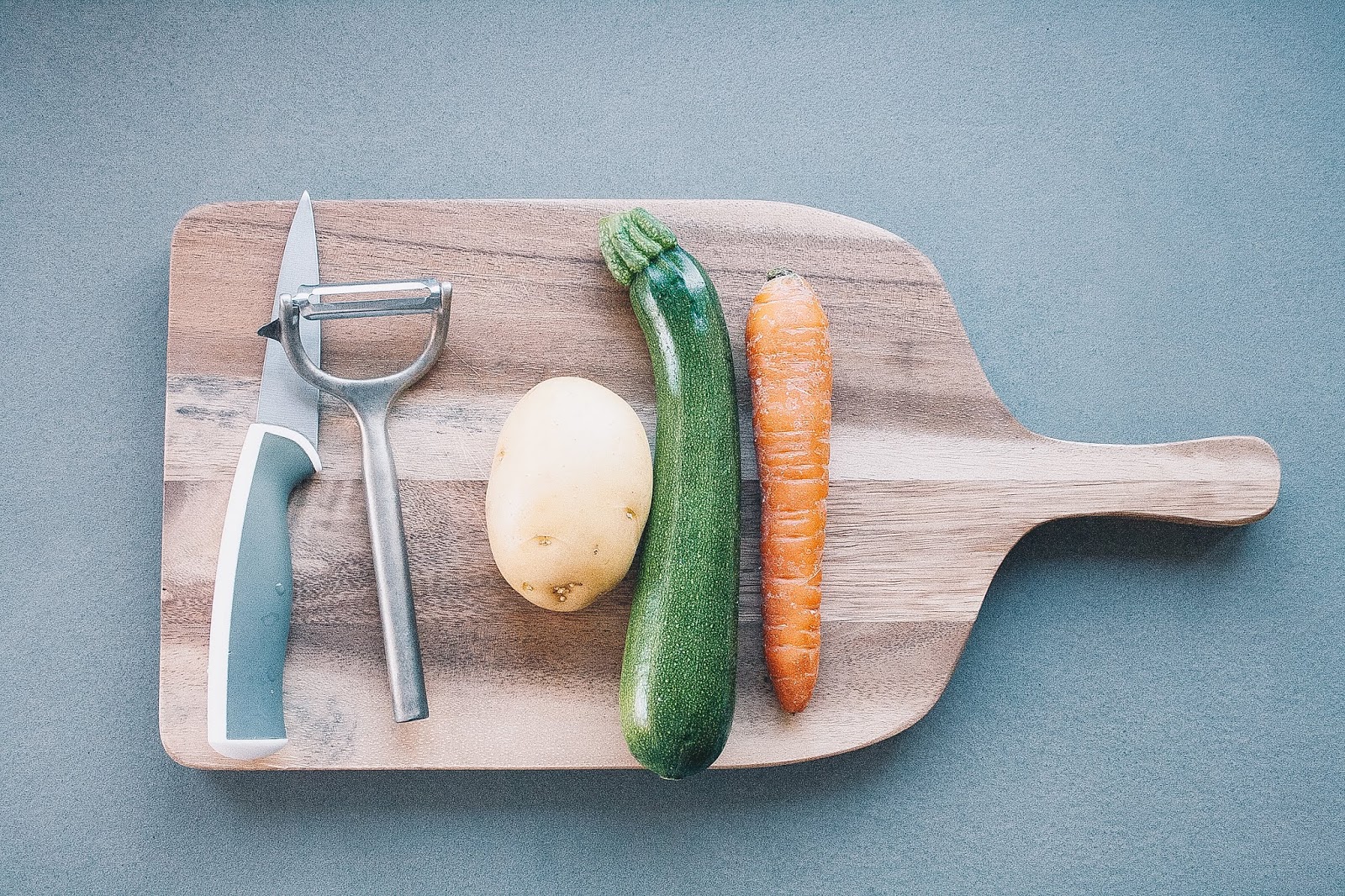 Pelate la patata, spuntate la zucchina, raschiate la carota e poi lavate tutte le verdure per bene.