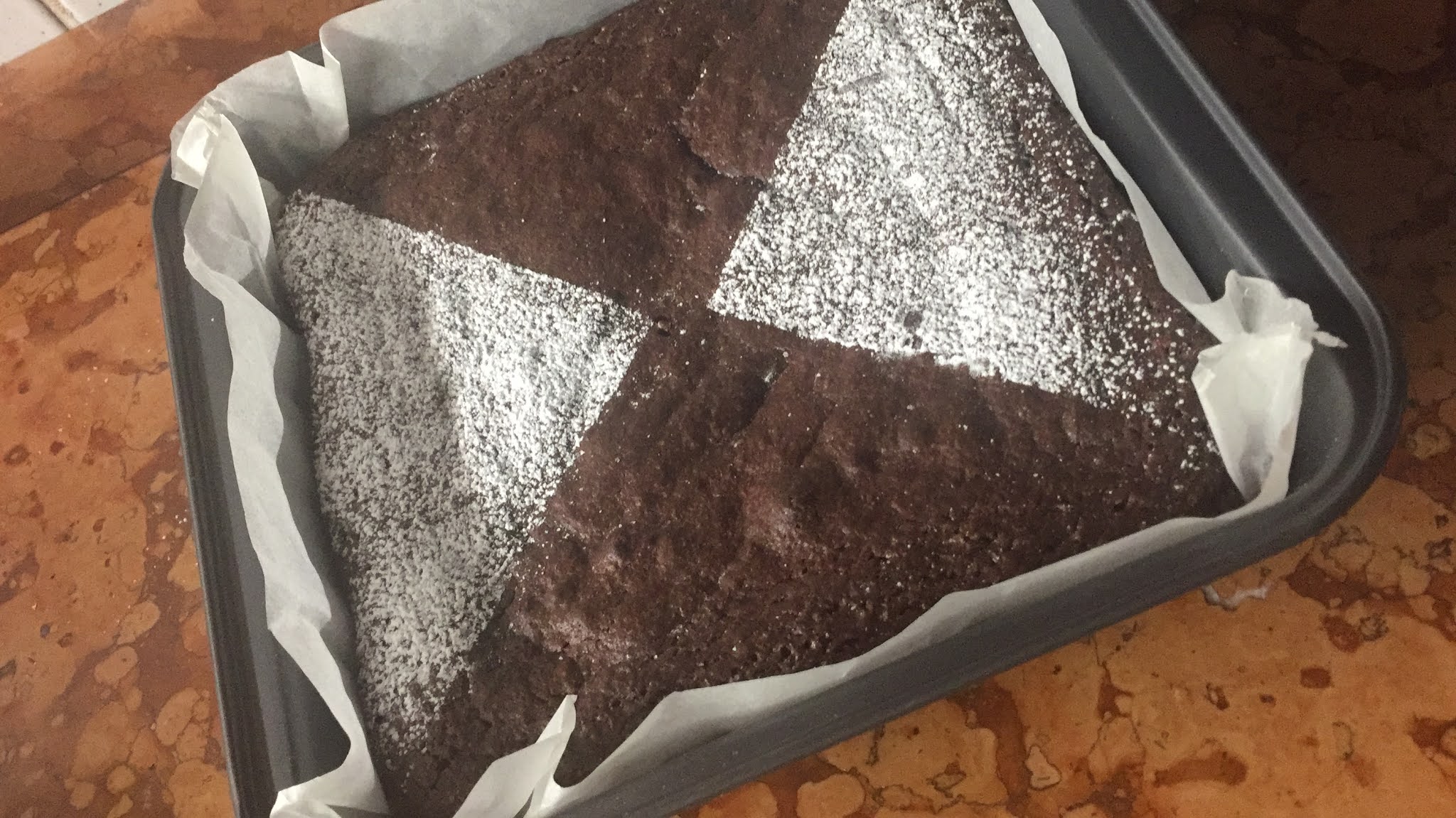 Foderate uno stampo 18×18 cm di carta da forno, versate il composto, livellatelo e fatelo cuocere per 35/40 minuti a 180° in forno preriscaldato.