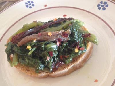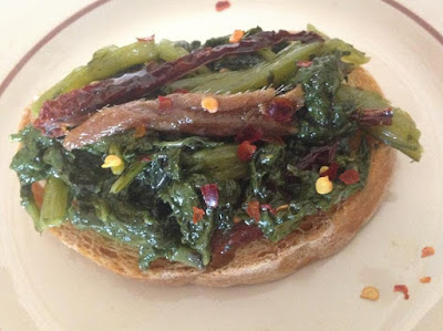 In una padella fate insaporire nell’olio evo uno spicchio d’aglio e due alici , appena queste si saranno sciolte aggiungete la bieta e qualche pomodoro secco tagliato a listarelle. Fate cuocere per circa cinque minuti a fuoco vivace. Infine adagiate la verdura sulle fette di pane, decorate con qualche filetto di alice e di pomodoro secco e condite con un filo di olio santo e del peperoncino in semi.