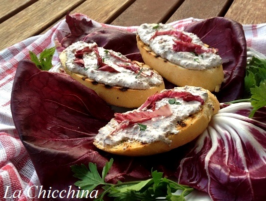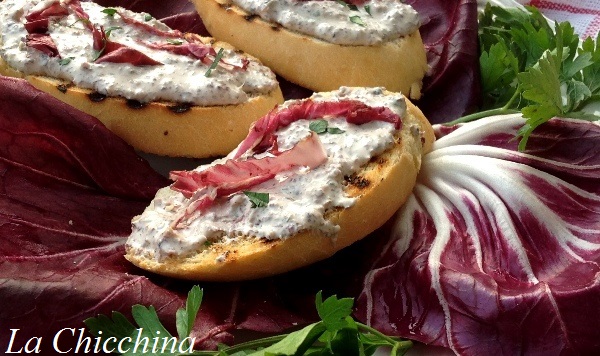 Quella che vi voglio proporre oggi è una bruschetta golosissima farcita appunto con una mousse composta da radicchio e formaggio spalmabile: veloce e semplice da realizzare, riscuote sempre successo… Io ho preparato delle “bruschettone” che possono quasi rappresentare un piccolo pasto o una merenda corposa ma, scegliendo fettine di pane piccine, queste bruschette possono ben figurare tra gli antipasti in un’occasione un po’ speciale.