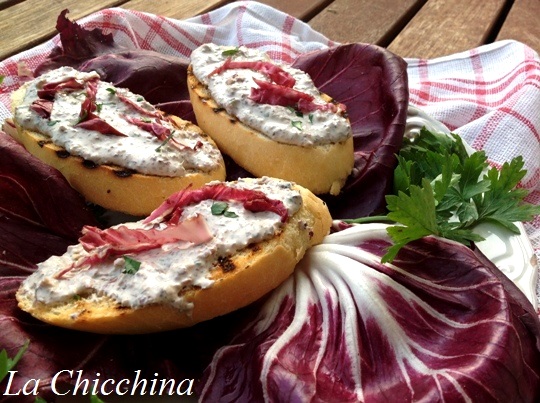 Quella che vi voglio proporre oggi è una bruschetta golosissima farcita appunto con una mousse composta da radicchio e formaggio spalmabile: veloce e semplice da realizzare, riscuote sempre successo… Io ho preparato delle “bruschettone” che possono quasi rappresentare un piccolo pasto o una merenda corposa ma, scegliendo fettine di pane piccine, queste bruschette possono ben figurare tra gli antipasti in un’occasione un po’ speciale.