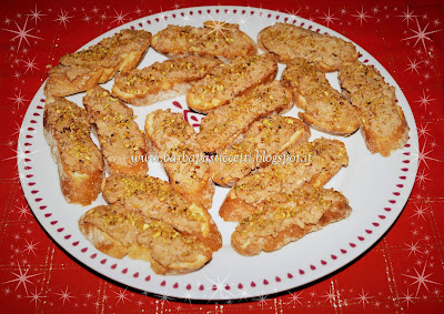 Utilizzando la sac a poche distribuire la crema di mortadella sulla superficie di ogni fettina di pane, sino a coprirla interamente e cospargere con la granella di pistacchi.